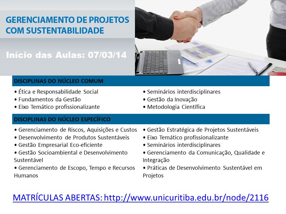 Para quem busca Inovação, qualidade e tradição recomendo o MBA em gerenciamento de projetos com sustentabilidade do Centro Universitário UNICURITIBA!