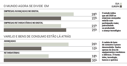 A BCG (Boston Consulting Group) fez um levantamento recente, onde já separa as empresas avançadas das retardatárias. A pesquisa contou com 1.300 executivos de diversos setores e faz um comparativo entre os EUA com a Europa. Onde é possível verificar que já existe uma segregação entre as empresas denominadas avançadas no digital e as retardatárias no digital. E esta diferença evidente na atualidade, já aponta sua criticidade para negócios diante de uma projeção tão próxima quanto 2020.