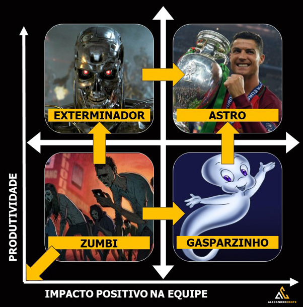 O quarto e último perfil é o Zumbi. Este é o perfil que se encontra no pior quadrante, oferecendo baixa produtividade e impacto negativo no restante do time. Isso porque sua interação pessoal e suas entregas são ruins e irregulares. Evidentemente que os Zumbis não são contratados assim. Nenhum Zumbi entra zumbi em uma organização. Ele é contaminado depois do que entra. Sobre esta contaminação abordarei no último artigo desta série. Mas o que podemos compreender por enquanto é que todo Zumbi já foi um Gasparzinho, um Exterminador ou mesmo um Astro um dia.