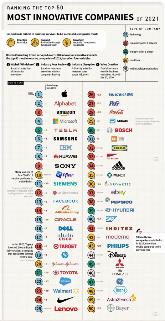 Desde 2020, as empresas do mundo todo estão passando por desafios. Alguns desses negócios falharam, outras simplesmente sobreviveram, se adaptaram e/ou inovaram. A Fast Company, determinou o seu ranking de 2021 das empresas mais inovadoras do mundo, divulgado em marca deste ano, analisando as empresas de 26 setores, destacando as quais incorporam soluções criativas para seus problemas e desafios, conseguindo superar as adversidades da crise imposta pelo Covid-19 e causando impacto pelo mundo, em seus setores ou mesmo na cultura local ao longo do último ano.