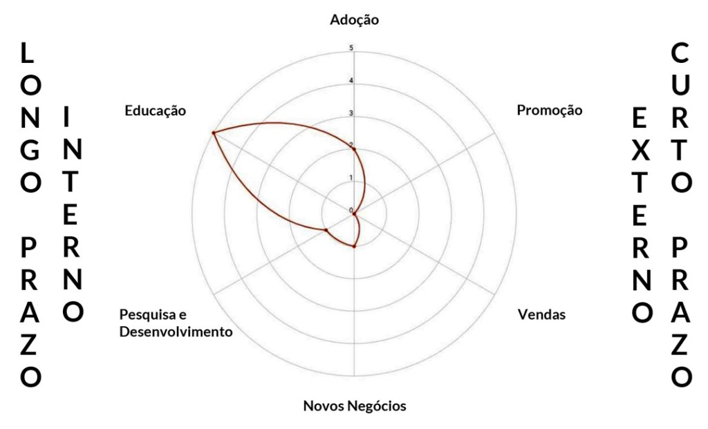 Enquanto Educação e P&D são benefícios internos e de longo prazo, Promoção e Vendas são benefícios externos e de curto prazo. Adoção e Novos Negócios podem representar cada uma das quatro características, dependendo da natureza da inovação. Observe no gráfico abaixo a avaliação de benefícios avaliados sob uma escala de 5 pontos (onde 0 = nenhuma contribuição e 5 = altíssima contribuição) para cada um dos 6 domínios. Esta ideia inovadora apresenta-se então, com objetivo voltado, fortemente, para o domínio de educação.