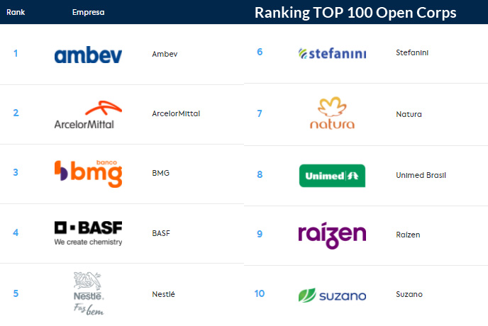 Além dos 2 rankings globais citados, trago ainda uma visão recortada especialmente para o Brasil com a 6ª edição do TOP Open Corps, realizado pela 100 Open Startups, principal plataforma de open innovation do país com foco na geração de negócios entre empresas e startups, que avaliou em sua metodologia 3.334 médias e grandes empresas que tiveram relacionamento de inovação aberta com um total de 2.344 startups. O estudo gerou pontuações para diferentes relações de inovação exclusivamente de empresas brasileiras com outros players do ecossistema, mensurados por meio da apresentação de contratos de parcerias estratégias, contratações de serviços, investimentos diretos, lançamento de desafios de inovação diretos ou intermediados, produção e/ou promoções de hackthons, criação de hubs, cursos e mentorias, participação em programas de incentivo, aceleração e conexão de inovação e startups.