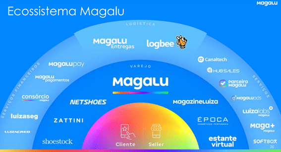 A Interbrands acredita que o sucesso de uma marca não depende apenas da sua autodefinição do que ela representa, mas também, sobre a determinação de para onde ela deve ir em seguida. E realizar Movimentos Icônicos tem se apresentado como um importante caminho para chegar lá rapidamente. É como um sistema de navegação GPS para as marcas. Tendo um destino definido como objetivo e um ponto de partida, uma leitura contínua das condições externas exige um recálculo de rota constante e em tempo real. E as marcas precisam da mesma agilidade que um navegador de GPS oferece. Mantendo contato constante com seus clientes, reorientando continuamente seus esforços para fazer movimentos que lhes permitam navegar pela incerteza e avançar em sua trajetória, rumo a um propósito maior. A Magazine Luiza, ou Magalu é uma das marcas que mais cresce nas últimas edições do Ranking Brasileiro da Interbrands e nitidamente é uma empresa que vem realizando estes movimentos na construção e na ambição de se tornar o ecossistema digital do varejo brasileiro, conforme visto no infográfico acima.