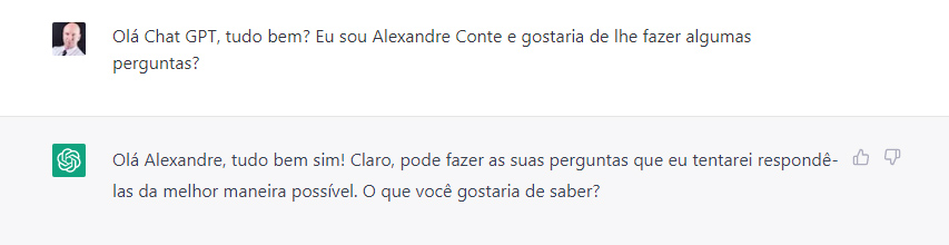 Chat GPT: Olá Alexandre, tudo bem sim! Claro, pode fazer as suas perguntas que eu tentarei respondê-las da melhor maneira possível. O que você gostaria de saber?