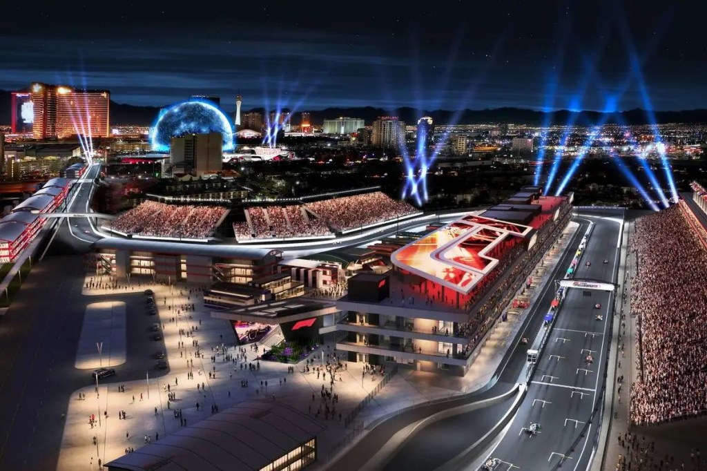 Desta vez o traçado é de rua e foi denominado “Circuito Urbano de Las Vegas”. O seu traçado vai passar pertinho da grande The Sphere, recém-inaugurada valorizará ainda mais as tomadas de câmeras, enquanto o teto da estrutura principal do Paddock recebeu um enorme painel de LED voltado para cima, para ser visto de cima. As zebras ganharam um charme extra com as cores e formas dos naipes do baralho.